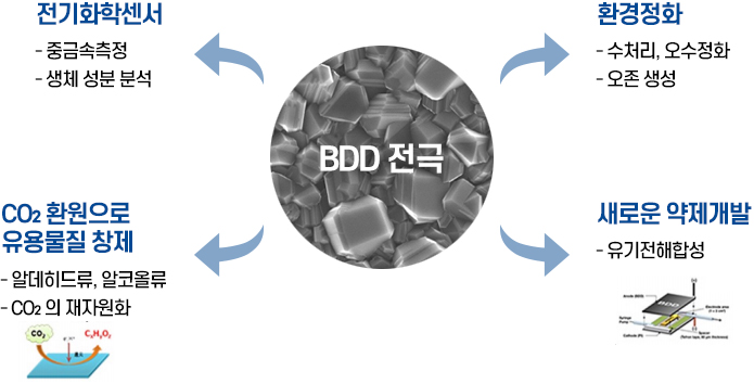 최근 다이아몬드 합성기술이 급속히 발전하면서 내마모성이 뛰어난 절삭공구를 넘어 환경과 반도체의 첨단기술 분야로 응용이 확대되고 있는 가운데, 전기 전도성을 지닌 다이아몬드 전극 (BDD Electrode)을 이용한 난분해성 수처리 기술과 단결정 다이아몬드를 기반으로 한 차세대 반도체 소자 기술이 주목 받고 있습니다.